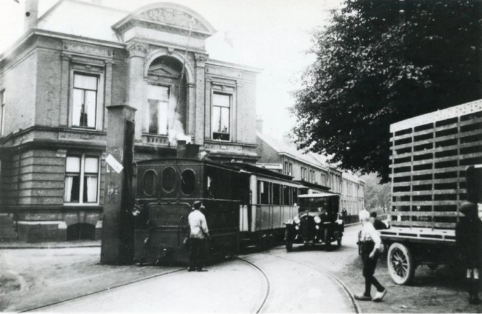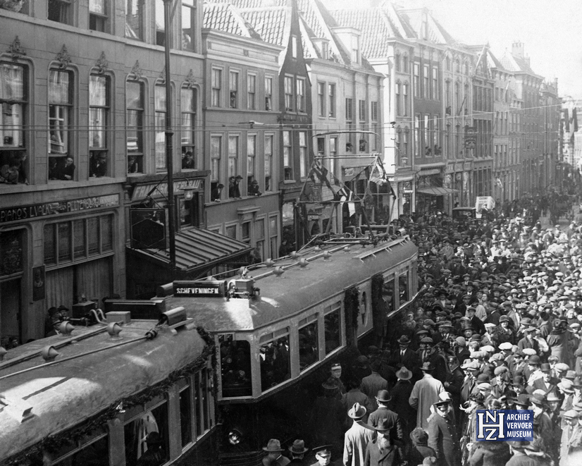 Openingsrit van de elektrische tram Leiden – Den Haag – Scheveningen op 11 april 1924. Leiden, Breestraat bij het stadhuis. Collectie Stichting NZH Vervoermuseum.