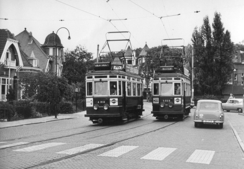 NZH tram A 323 ontmoet haar collega, de A 318, in de Geversstraat te Oegstgeest. 3 oktober 1960.