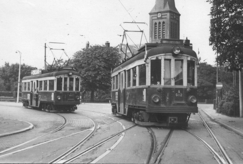 NZH A 514 en NZH A 512 respectievelijk de B- en C-dienst van en naar Rijnsburg ontmoeten elkaar op de splitsing van de lijnen naar de kust en Oegstgeest Kerkbuurt (voor 1949 Haarlem), Leidsche buurt te Oegstgeest. 3 oktober 1960.