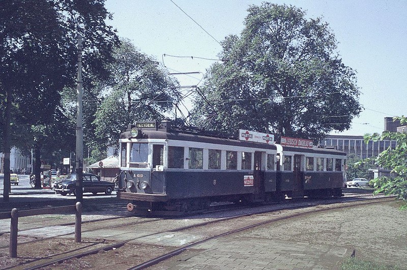 NZH tram A 619/A620 (C-dienst) is zojuist vertrokken van het eindpunt Malieveld in Den Haag en is onderweg naar Leiden. Bezuidenhout 1961.