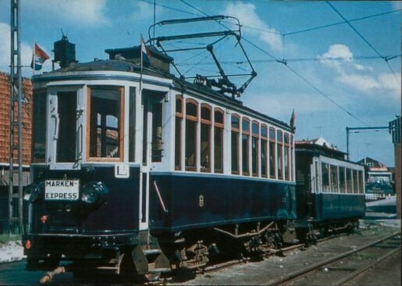 Een toeristische tram , dienst L1, “avant la lettre”. De Marken-Express, diensten L1 en L2, vervoert in de jaren vijftig veel, voornamelijk Amerikaanse, toeristen van Amsterdam naar Volendam. Voor dienst L1 is bijna altijd de A25 met By11 gebruikt.