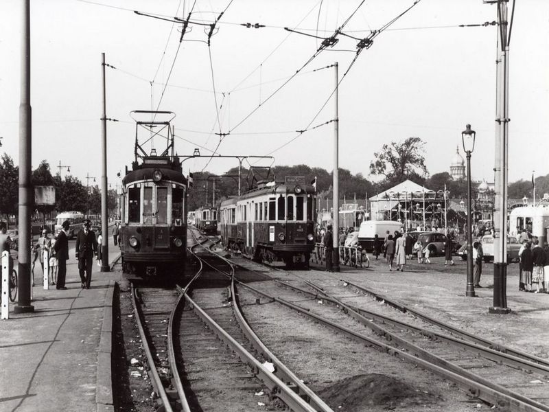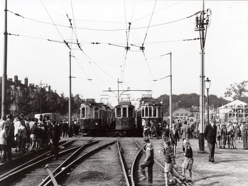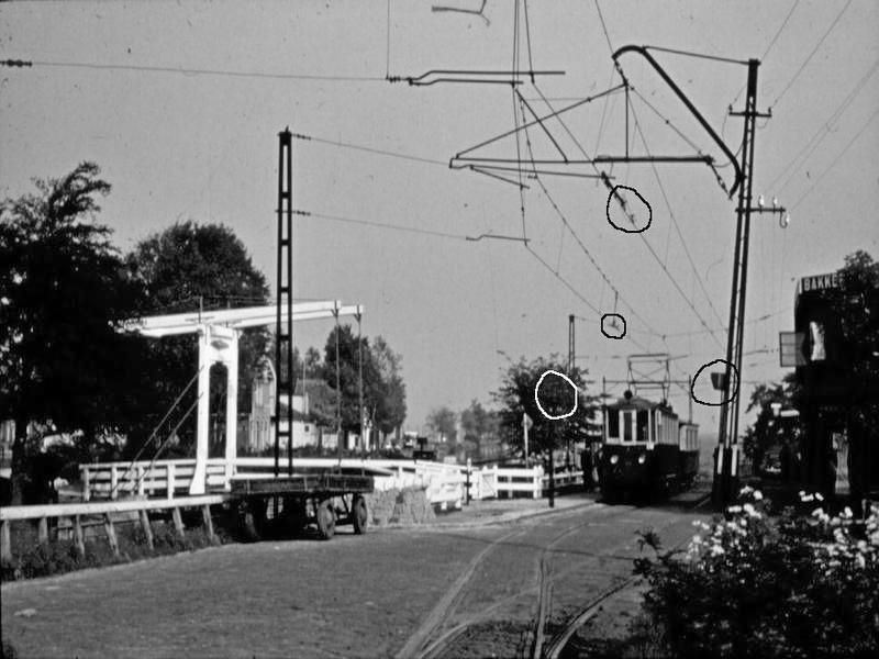 In de linker bovenleiding is de inrijschaats en rechts de uitrijschaats te zien. Verder is op de mast met dubbele uithouder het groene gedoofde sein en links een paal met het rode sein (brandend, anders zou het personeel niet buiten staan) waar te nemen. De tram bestaat uit elektrisch motorrijtuig A77 en een By.