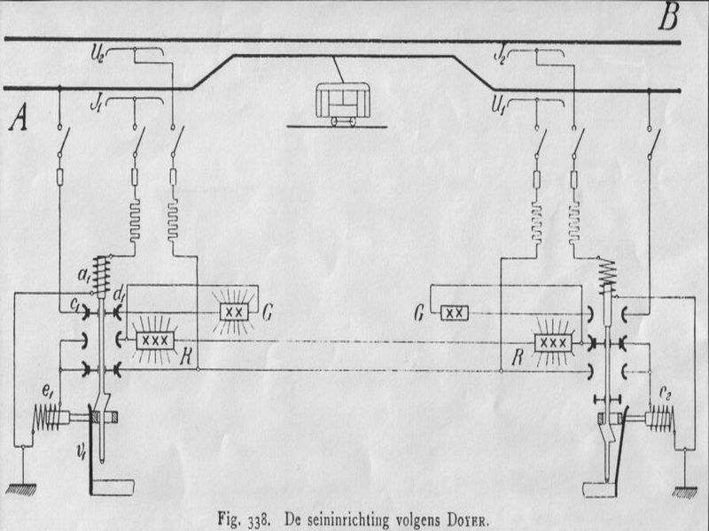 De rode seinen moeten voorkomen dat volg- of tegentrams het enkelsporige baanvak “nemen”. Als de tram geen groen licht krijgt, een situatie die zich voordoet als een tegentram op hetzelfde moment ook het enkelspoor wil nemen, dan mag de tram niet verder rijden en volgt overleg met de haltechef waaronder dit baanvak valt. Zodra met de uitrijschaats U1 contact wordt gemaakt wordt de ruststand bereikt waarbij alle seinen uit gaan. Van de twee van A naar B lopende leidingen zorgt de bovenste leiding voor de lampenstroom. Namelijk voor het “tegen”sein bij B als een tram naar B gaat en voor het “tegen”sein bij A als een tram naar A gaat. De onderste leiding zorgt voor de relaisstroom, die is nodig voor het tot stand brengen van de ruststand. De plaats van de bovenleidingschaatsen is op de bovenleidingmasten aangegeven door een daarop geschilderde wit, paars, witte band.