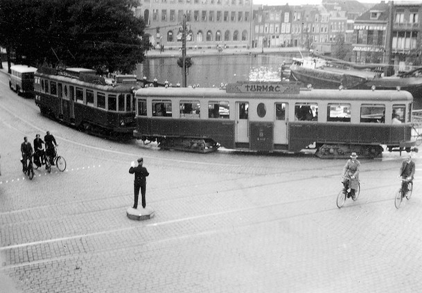 U ziet hier een A/B400-tramstel dat vanaf de Blauwpoortsbrug in Leiden de Prinsessekade oprijdt richting Den Haag. Foto uit de jaren ’30.