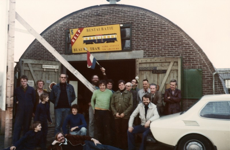 Foto uit 1977 van de werkgroep Voorburg tijdens de restauratie van de NZH B412.