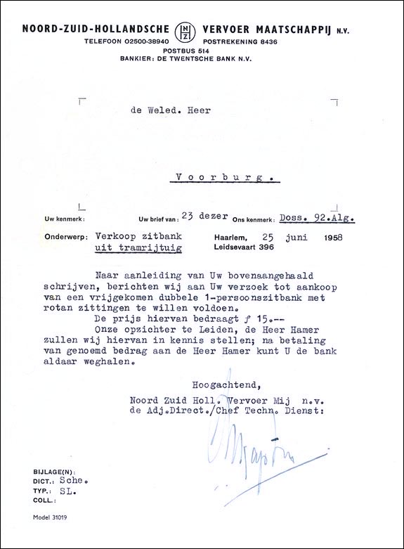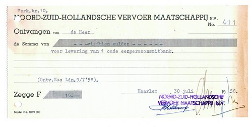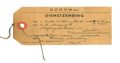 Het label, dat bevestigd was aan de messing handgreep van de zitbank. De zending ging per tram van Leiden naar de remise in Voorburg. Na betaling van vijftien gulden kon de bank in ontvangst worden genomen. Aldus is hierbij het bewijs van echtheid geleverd van de legaal verkregen trambank. Destijds had de heer Vreeswijk nog geen idee, dat “zijn” trambank met het verstrijken der jaren, zo’n cruciale rol zou spelen, waardoor men vandaag de dag de sfeer van de legendarische NZH-Blauwe Tram (Boedapester) nog kan herbeleven.
